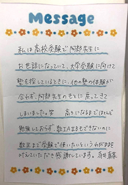 私は高校受験で阿部先生にお世話になっていて、大学受験に向けて塾を探しているときに、他の塾の体験が合わず、阿部先生のもとに戻ってきてしまいました。笑